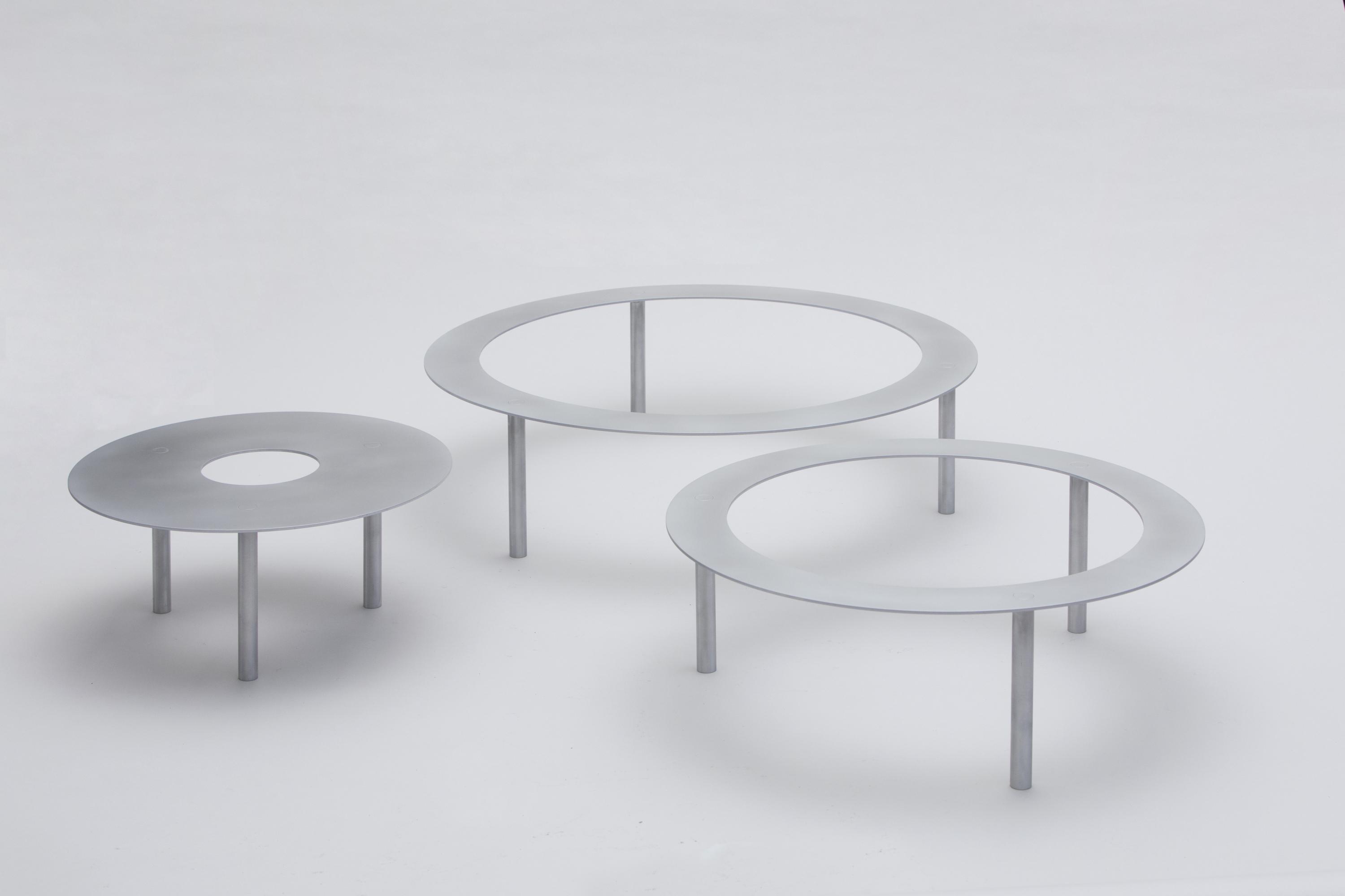 The KRUG table is composed of a series of concentric circles, resulting in an object that can be configured as a single table made of three nested elements or separated into two or three individual tables. While the smallest element functions as a coffee table, the other two—with their more ambiguous forms—challenge conventional notions of functionality and invite the user to assign new purposes to them.