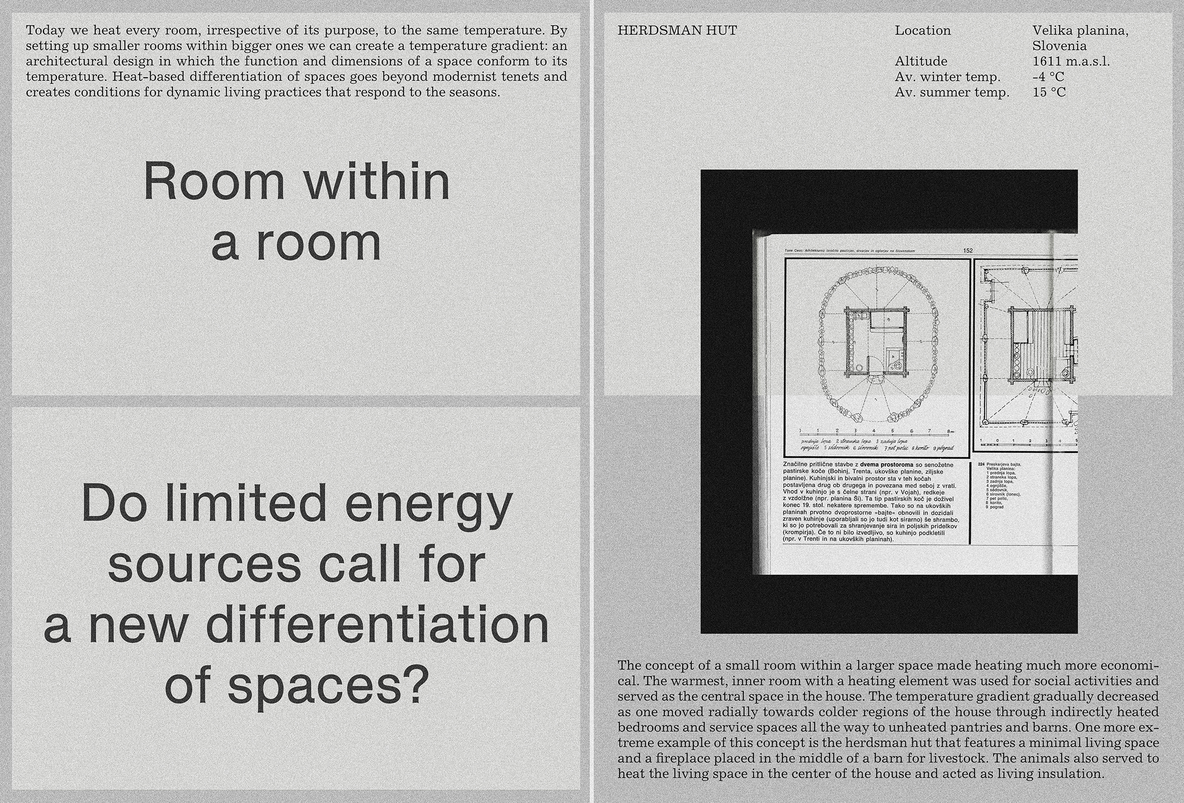 In search of an alternative to existing building systems, the authors of +/– 1 °C: In Search of Well-Tempered Architecture project, together with fifty European architects and creatives, researched and analysed examples of vernacular buildings from Europe that, unlike current contemporary practice, address the issue of ecology holistically, as an integral part of the architectural design. Vernacular architecture is thus understood as a living example of energy principles that are relevant for the present time and that can be used as a basis for a critical reinterpretation of contemporary architectural production.