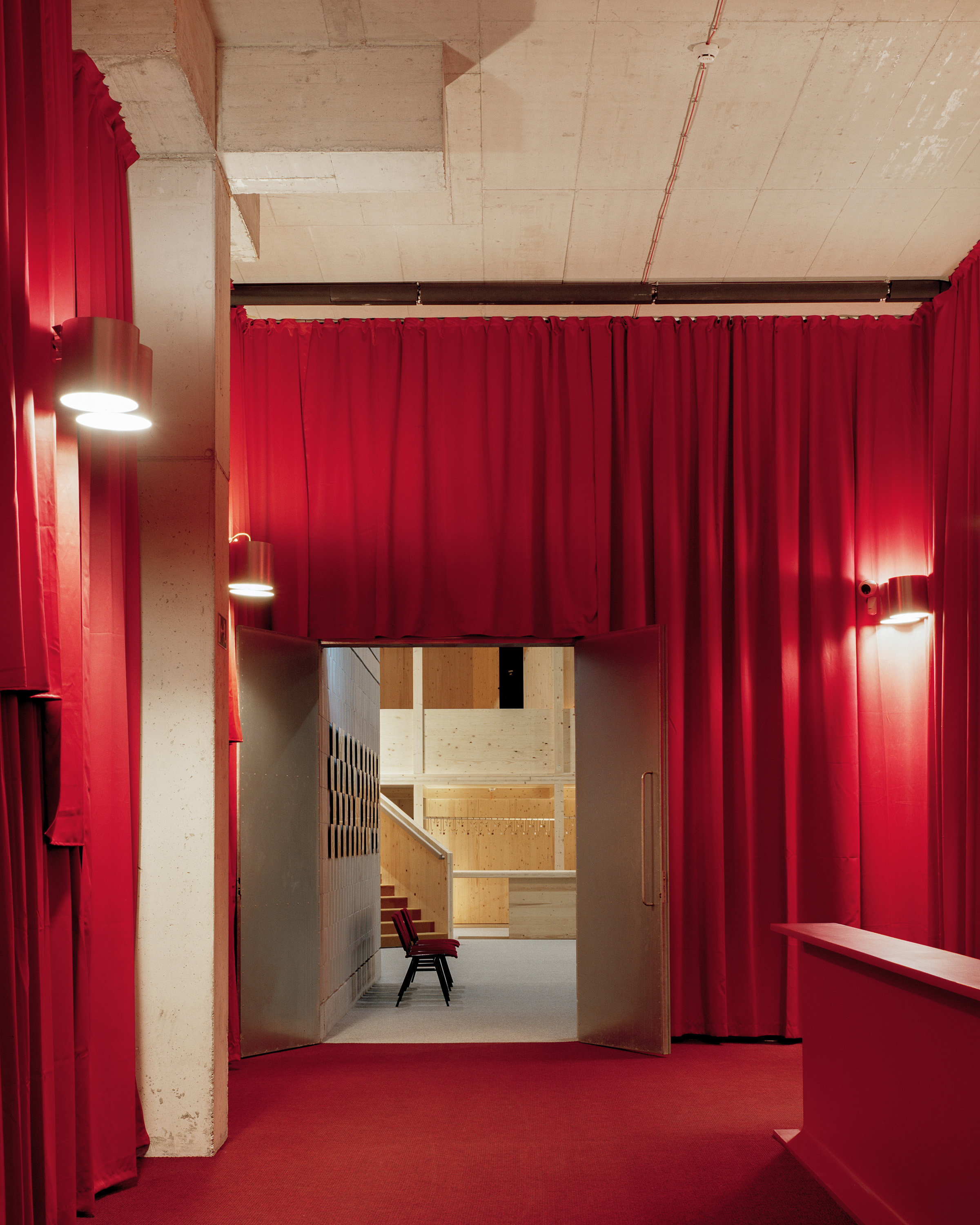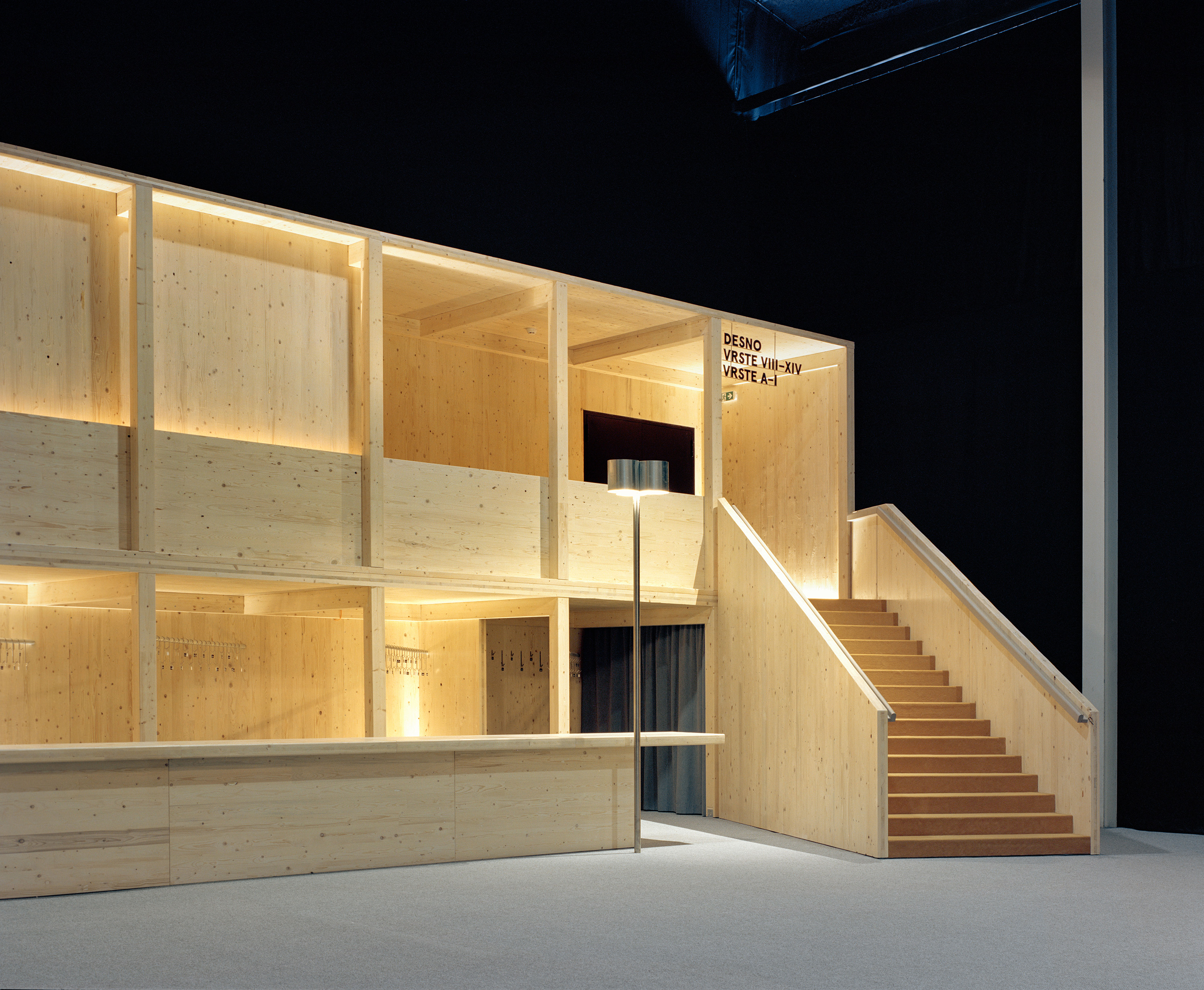 The temporary architectural interventions in the historic structure are made of materials that are recycled or reusable, with the aim of creating as little waste as possible. The large-sized cross-laminated (CLT) wooden panels used to construct the Grand Stage are made of thermally and acoustically suitable material, and enabled quick and precise execution, and after changing the content, they can be easily dismantled and will be reused for the construction of a new building. The parts of the building that will be in use later, after the SNT Drama ceases to operate on the site - “public infrastructure” - are made of durable material - exposed concrete: entrance parts of the Grand Stage and the Small Drama, the “pavilion” with an internal bar and a public terrace. The spatial design and material definition of the project creates diverse environments that create a recognisable image of the new theatre.