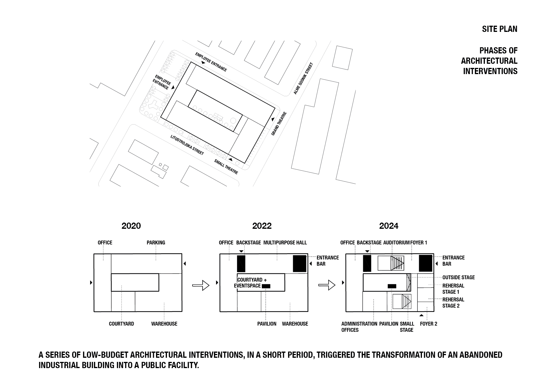 The temporary spaces of the Slovenian National Theatre Drama Ljubljana are located in a complex of former industrial halls from the 1960s, in the Litostroj area of ​​Ljubljana, Slovenia. An important public cultural program activates the gray zone of the city and thus, as in similar situations in other European capitals, “expands” the city center. By establishing a new programmatical center on the fringe of the city, the project is also socially inclusive. A series of low-budget interventions, in a short period triggered the transformation of an abandoned industrial into a new public building.
