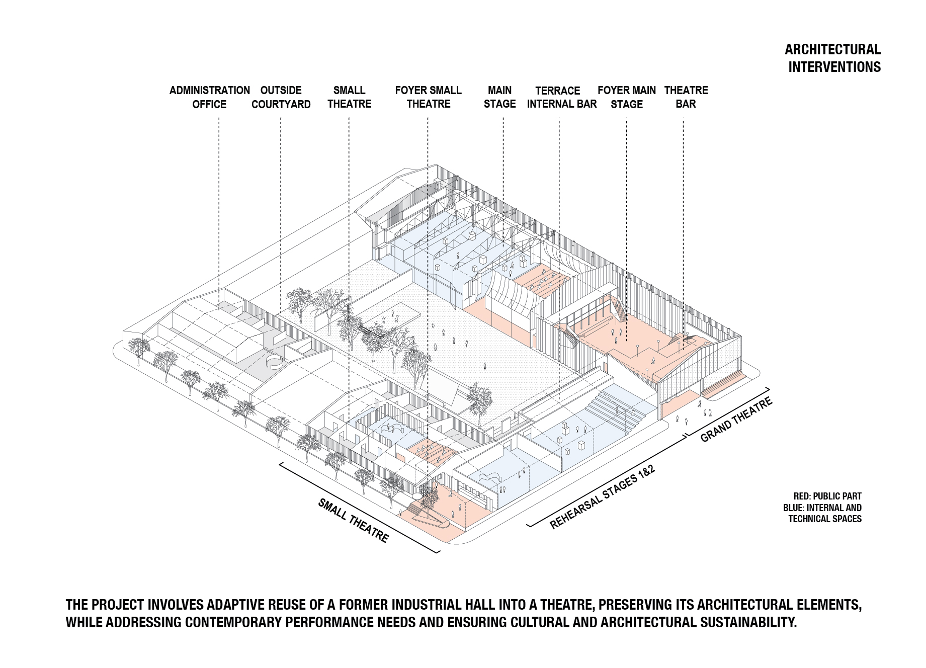 The project involves adaptive reuse of a former industrial hall in to Temporary National Theatre, during renovation of its historic building in the city, preserving its architectural elements while addressing contemporary performance needs and ensuring cultural and architectural sustainability.